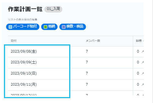 ワークスペースに登録されている営業日毎の作業計画の一覧です。