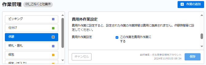 「休憩」の作業を登録し、費用外作業に設定しています。