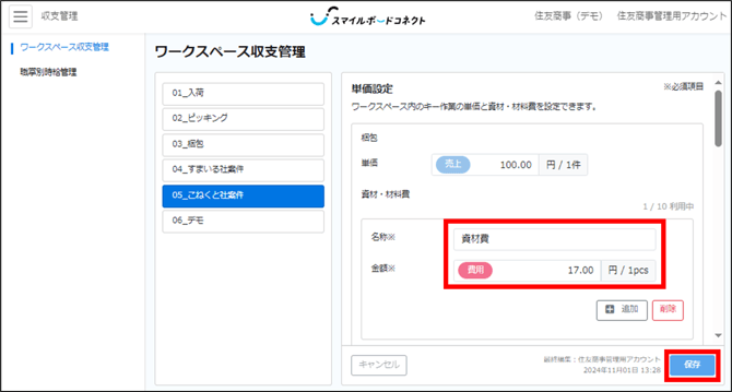 ワークスペース費用は1ワークスペースあたり最大20件まで設定可能です。 - [保存]をクリックで設定完了