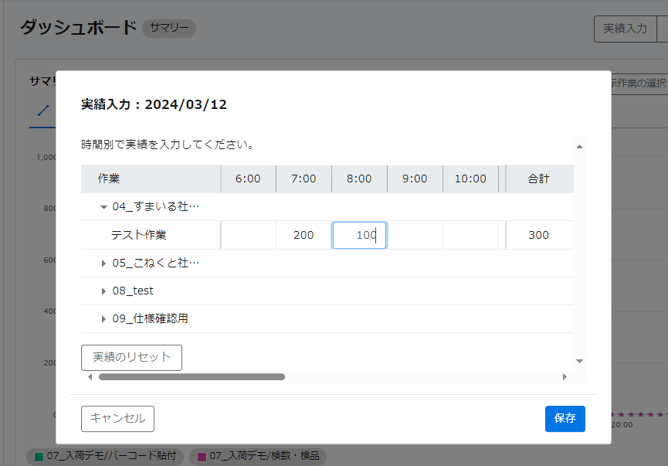 →実績入力方法について詳しくはこちら - 表示されるモーダルにて、時間別で各作業の実績数量を入力することができます。