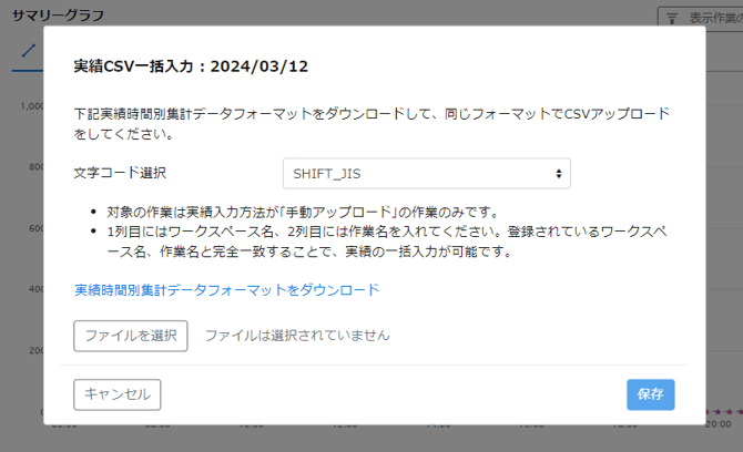 実績一括入力シートは事業所に登録されている作業に合わせて都度生成しています。最新のシートをダウンロードしてご利用ください。 - [ファイルを選択]をクリックし、対象CSVファイルを選択します。選択が完了すると、選択したファイルのファイル名が右に表示されます。