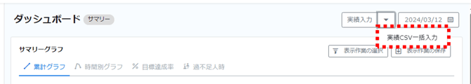 - [実績入力]ボタン横の[▼]をクリックした時に表示されるドロップダウンメニューから[実績CSV一括入力]をクリック