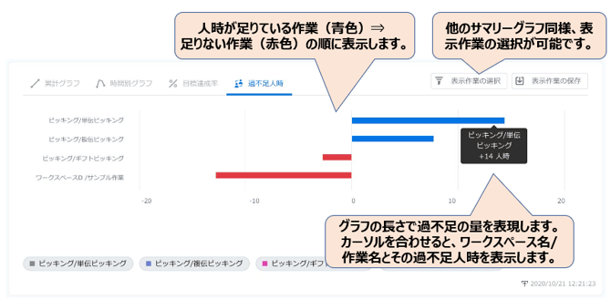 - 該当の営業日中の表示選択している作業の過不足人時を比較できるグラフです。