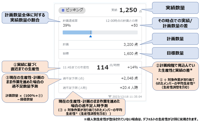 実績数量 / 直近の更新時までにメンバーのスケジュールに該当の作業が割り当てられた時間の総計 - ①と設定されている人時生産性に生産性調整を乗じた数値と比較した増減率を②とします。